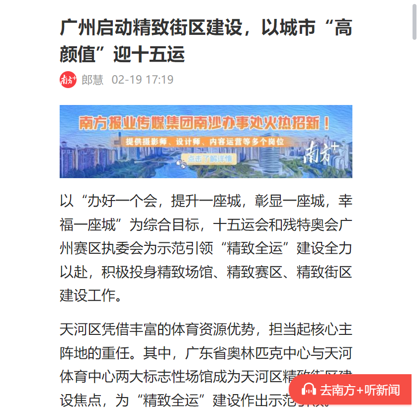 近日,南方+推出專題報道《廣州啟動精致街區建設,以城市“高顏值”迎十五運》,深度聚焦集團廣東省奧林匹克體育中心(以下簡稱“奧體中心”)、天河體育中心場館周邊精致街區示范段改造提升工程。作為廣東省勘察設計行業領軍企業,集團以技術為支撐,用“繡花功夫”推進城市有機更新,為羊城打造“精致全運”注入新動能。