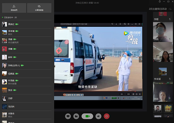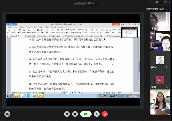 支部書記李蔚肯定了大家的學習成果,就疫情期間以及下一階段工作進行了部署,提醒大家疫情情況趨于向好,但更要警惕麻痹思想、僥幸心理,必須繼續做好各項防護工作。同時支部黨員要快速適應線上辦公新模式,作為中堅力量,在推動項目進展方面發揮中流砥柱的作用,努力完成全年的生產目標。