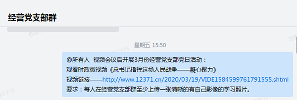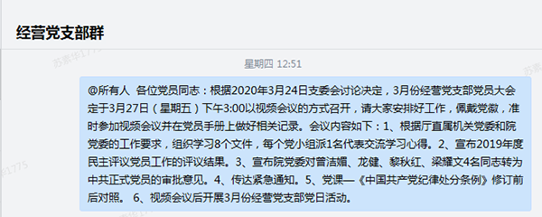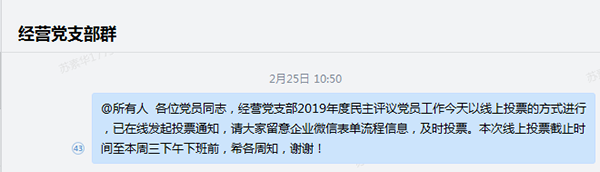 經營黨支部利用企業微信的視頻會議和表單流程功能,嚴格按照評議程序,認真組織開展了2019年度民主評議黨員工作。同時,還積極開展線上交流互動,支部黨員們談學習感悟和思想狀態,使支部及時掌握黨員的所思所想,精準做好關心關愛工作,為抗擊疫情和推進復工復產營造了良好氛圍,提升了支部的凝聚力和戰斗力。